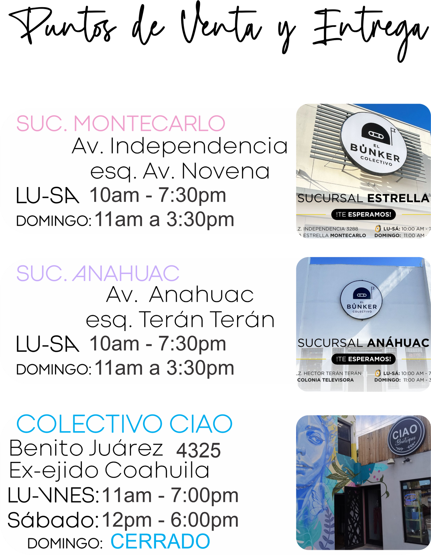 En cada uno de nuestros puntos de venta, podrás encontrar algunos de nuestros productos. También, podrás realizar pedidos en línea y solicitar recolección en el punto más cercano a ti.